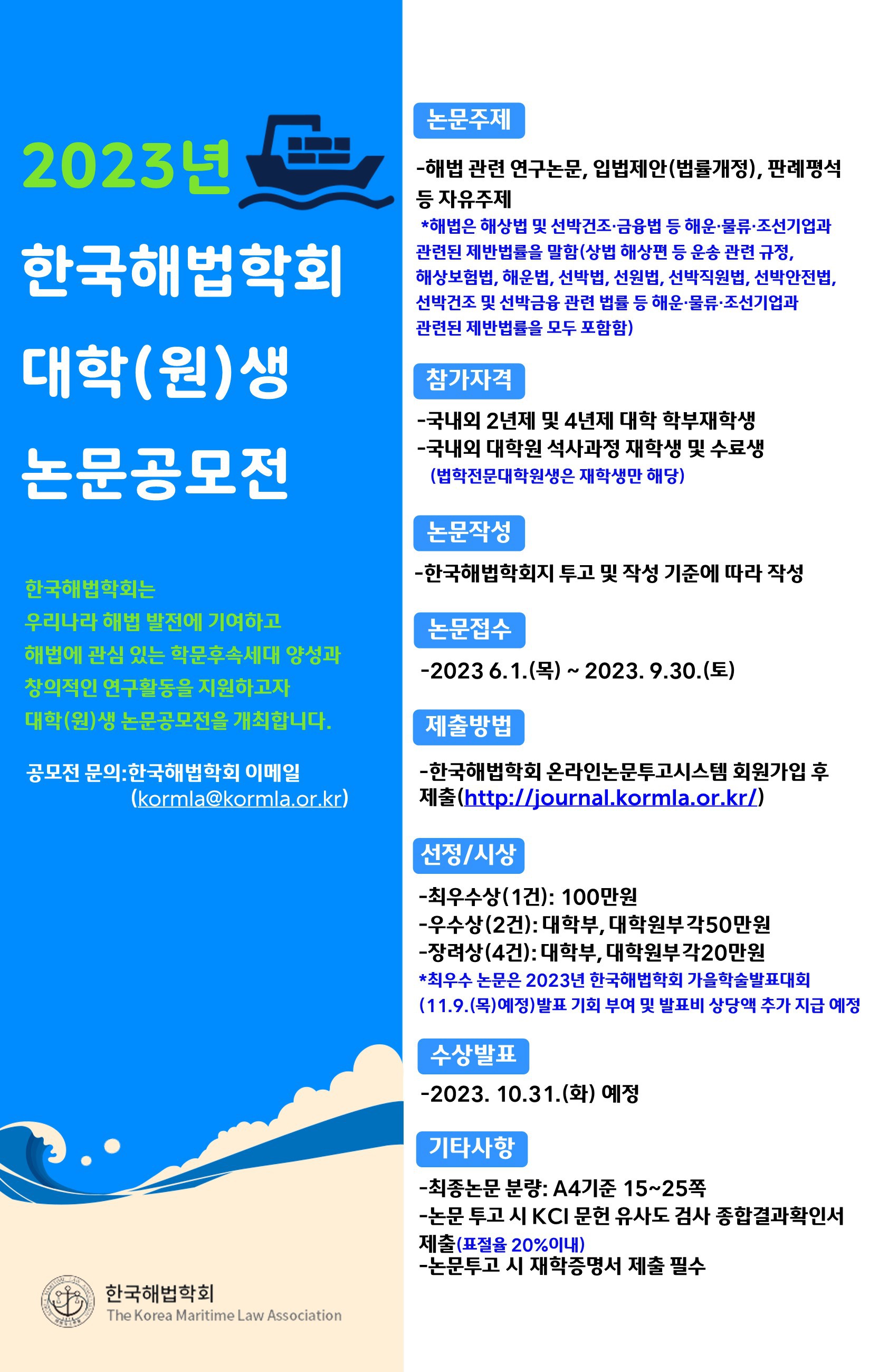 ※ 최우수 논문은 2023년 한국해법학회 가을철 학술발표회 (11.9.(목) 예정) 발표 기회 부여 예정 (발표비 상당액 추가 지급)