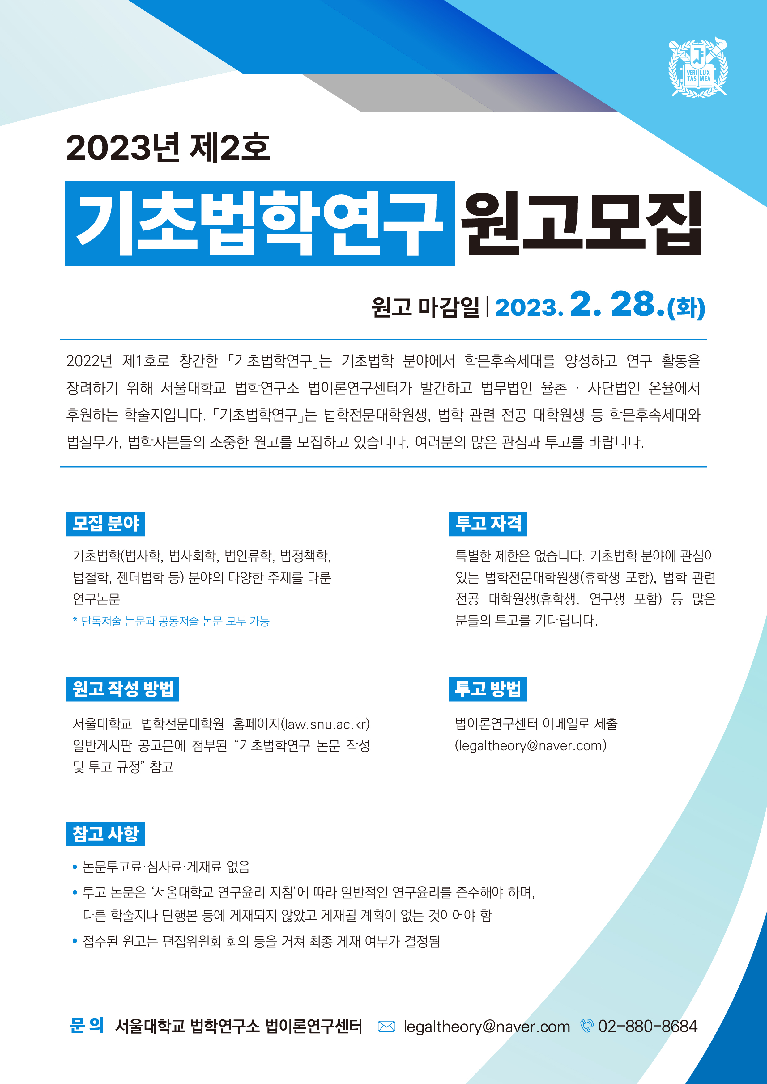 2022년 제1호로 창간한 「기초법학연구」는 기초법학 분야에서 학문후속세대를 양성하고 연구활동을 장려하기 위해 서울대학교 법학연구소 법이론연구센터가 발간하고 법무법인 율촌 · 사단법인 온율에서 후원하는 학술지입니다. 「기초법학연구」는 법학전문대학원생, 법학 관련 전공 대학원생 등 학문후속세대와 법실무가, 법학자분들의 소중한 원고를 모집하고 있습니다. 여러분의 많은 관심과 투고를 바랍니다.