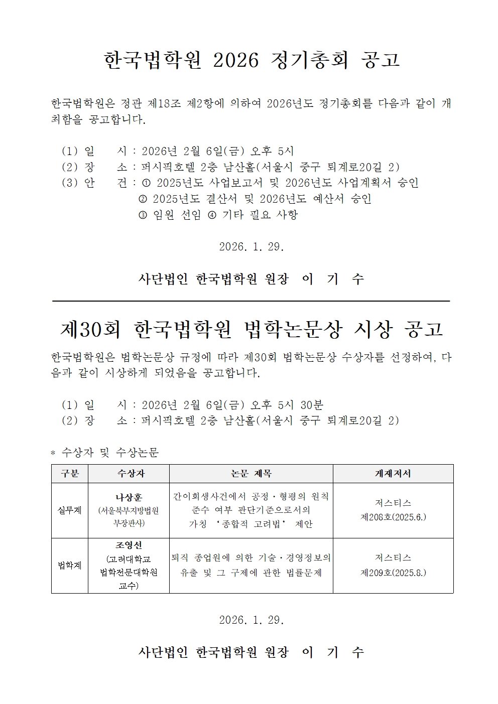 2026년도 정기총회 및 제30회 법학논문상 시상식 개최