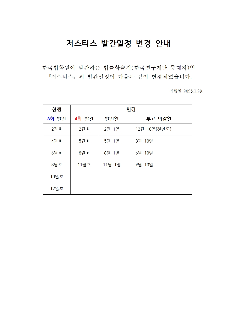 한국법학원 발행 법률학술지 『저스티스』 발간일정 변경 안내
