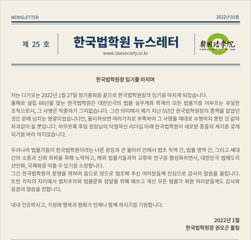 2022년 1월 25일 발간된 한국법학원 뉴스레터 제25호입니다.