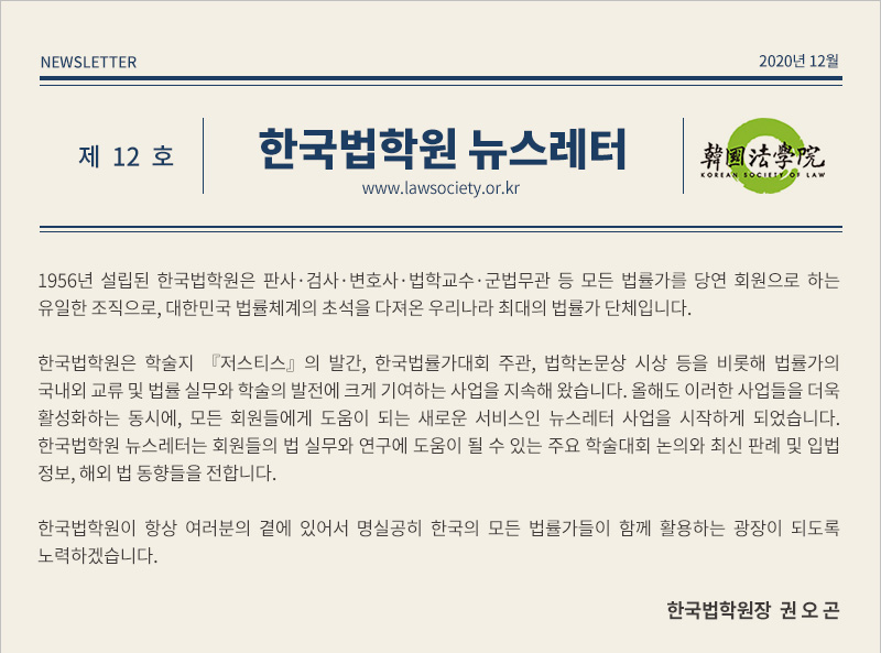 2020년 12월 22일 발간된 한국법학원 뉴스레터 제12호입니다.