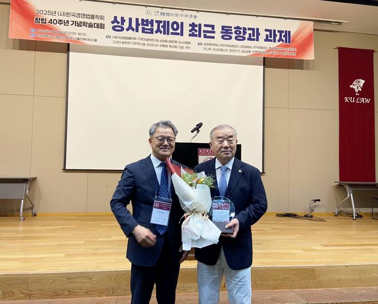 이기수 한국법학원장은 9월 19일 오후 고려대학교에서 열린 “2025년 (사)한국경영법률학회(회장 유주선) 창립 40주년 기념학술대회”에 참석했다. 이날 개회식에서 이기수 원장은 1996년부터 1998년까지 한국경영법률학회 제3대 회장을 역임하며 학회 발전에 기여한 공로를 인정받아 명예 공로패를 수상했다. 이어 유주선 학회장의 사회로 이기수 원장, 최완진 명예교수(한국외국어대), 김정호 명예교수(고려대)가 참여한 대담이 진행되었으며, “(사)경영법률학회 40년의 역사와 발전, 앞으로의 과제”를 주제로 학회의 성과와 향후 방향을 모색하는 자리가 마련됐다.
