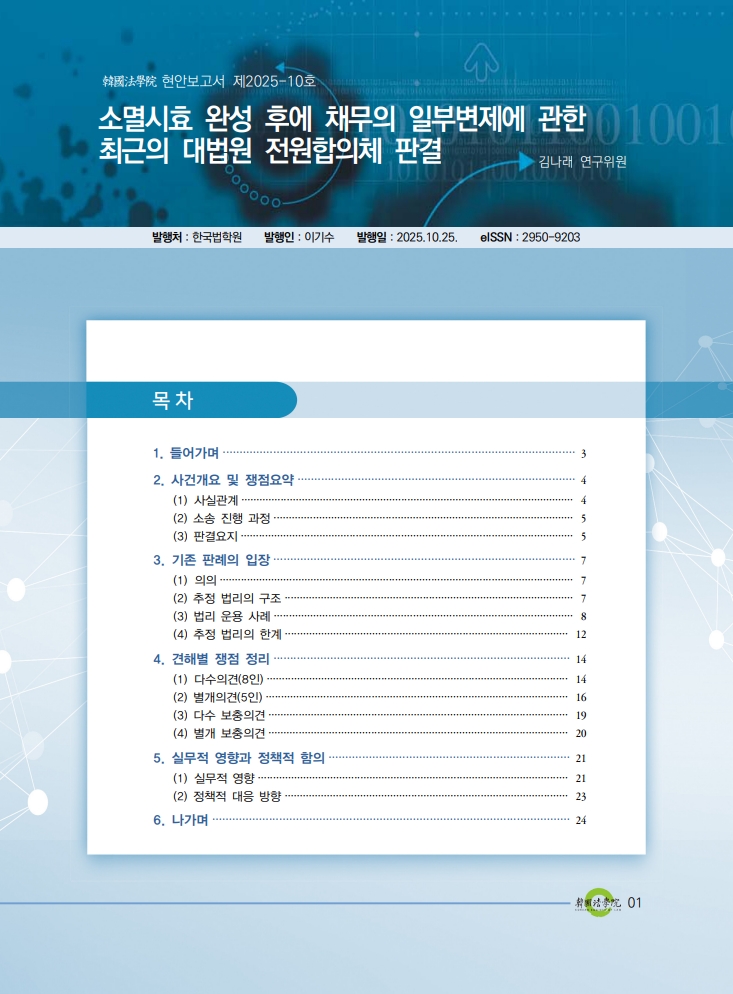 한국법학원 학술연구부 민사법팀 김나래 연구위원은 "소멸시효 완성 후에 채무의 일부변제에 관한 최근의 대법원 전원합의체 판결"이라는 주제로 현안보고서를 발표했다.