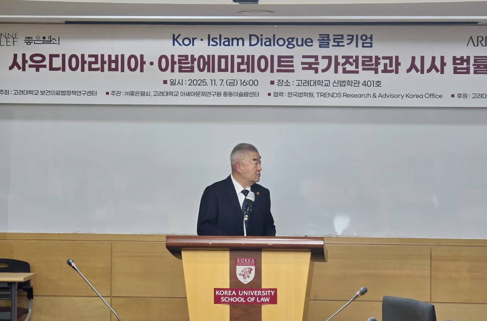 이기수 한국법학원장은 11월 7일 오후 고려대학교에서 열린 ‘Kor·Islam Dialogue’ 콜로키엄에 참석해 축사를 했다. 이번 행사는 고려대학교 법학연구원 보건의료법정책연구센터가 주최하고, 고려대학교 아세아문제연구원 중동이슬람센터(소장 김종도)와 ㈜좋은열쇠(대표 김현종)가 주관했다. ‘Kor·Islam Dialogue’ 콜로키엄은 한국과 이슬람 사회 간의 이해와 정책·산업 협력 확대를 위한 첫 공식 논의를 진행하는 자리로, ‘한국이 중동을 어떻게 이해하고, 어떻게 함께 성장할 것인가’에 대해 심도 깊은 논의가 있었다. 이 원장은 축사에서 “지구촌 인구의 약 1/4은 이슬람 문화권에 속한 만큼, 대한민국과 이슬람 사회의 건전한 가교를 비전으로 코이슬람 다이얼로그(Kor·Islam Dialogue)가 출범하는 것은 매우 뜻깊은 일”이라고 강조했다.