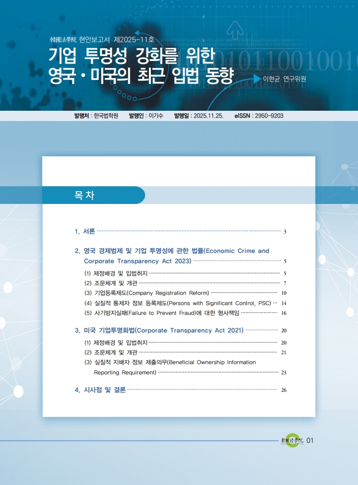 이에 본 보고서는 영국의 ECCTA와 미국의 CTA를 중심으로, 양국의 기업투명성 제도가 형성된 입법배경과 구조적 특징을 비교·분석하고, 이를 토대로 한국의 기업법제·형사법제·자금세탁방지법제에 대한 시사점을 도출하는 것을 목적으로 한다.