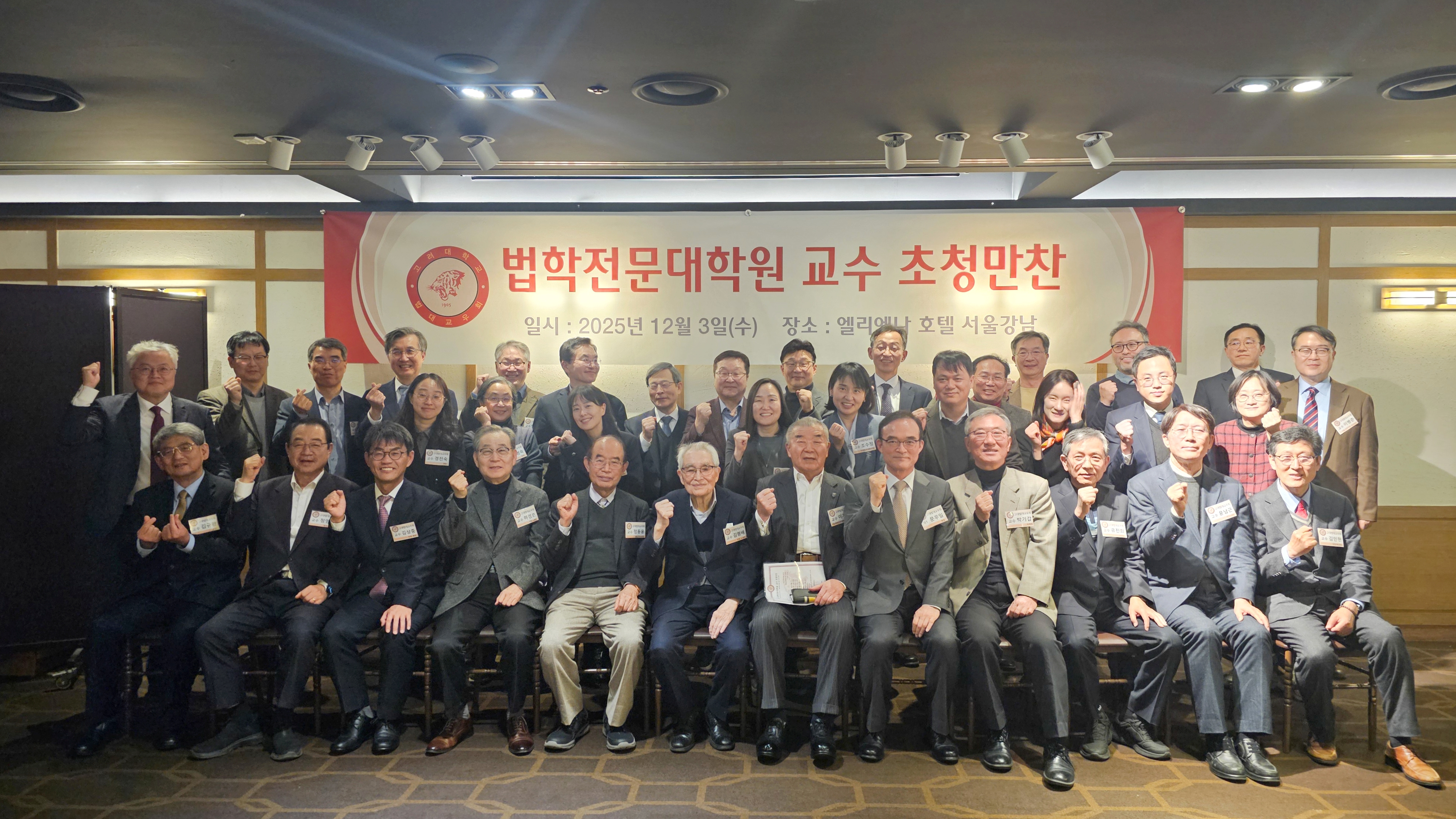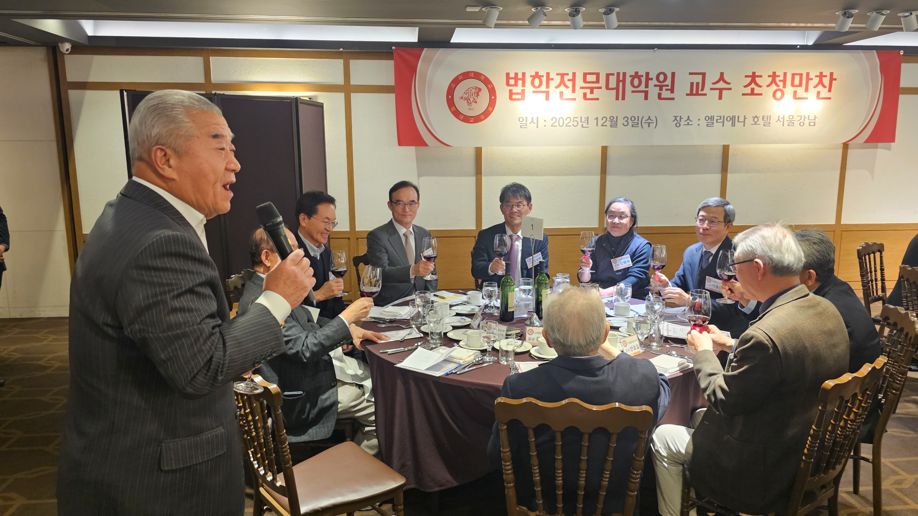 이기수 한국법학원장은 12월 3일 저녁 고려대 법대교우회(회장 문무일) 주최로 엘리에나호텔서울강남에서 열린 법학전문대학원 교수 초청만찬에 참석했다. 이 원장은 1984년부터 고려대 법대 교수로 임용된 이후 2011년 정년퇴임했으며, 현재는 명예교수로 활동하고 있다.