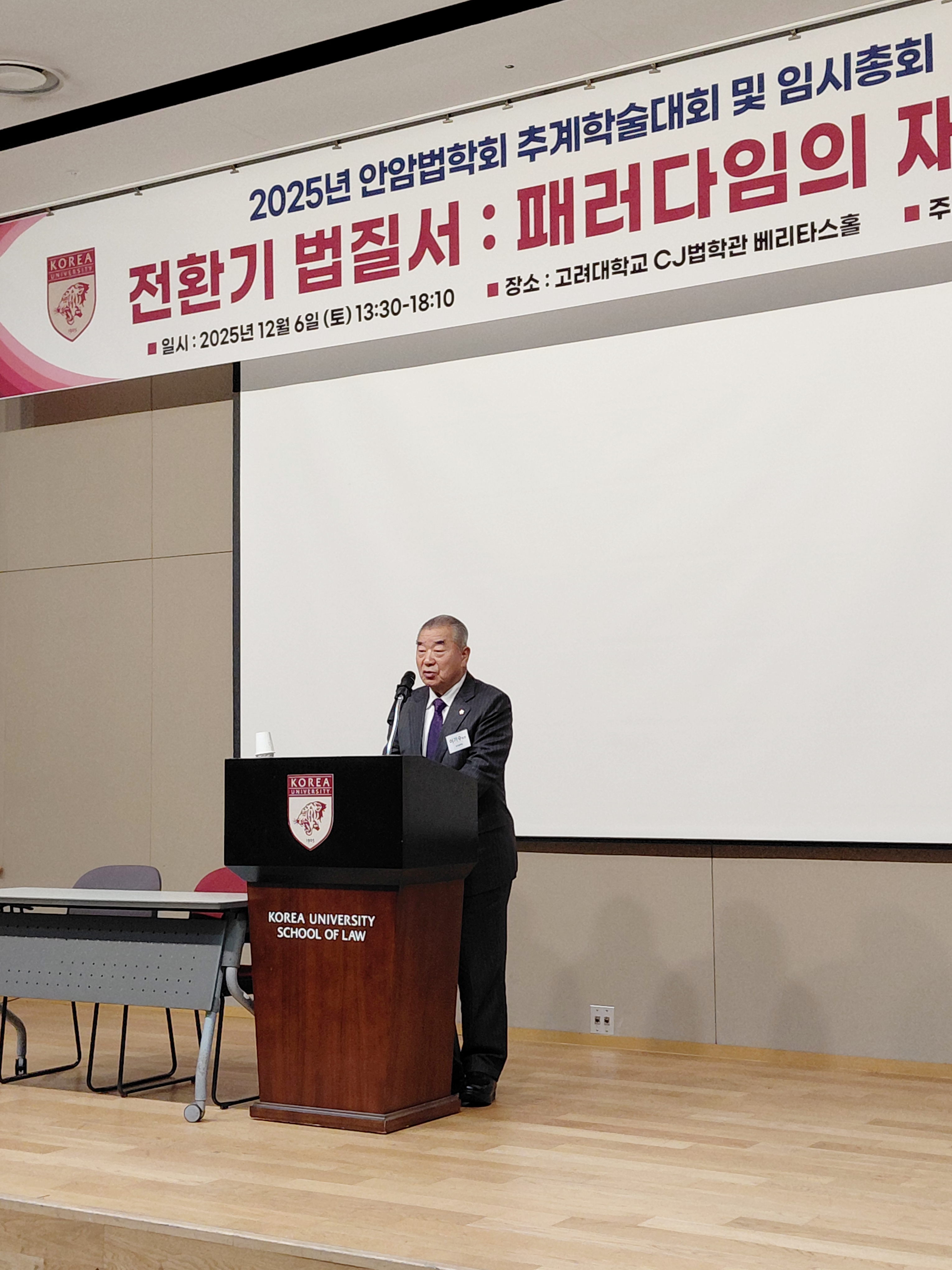 이기수 한국법학원장은 12월 6일 오후 고려대학교에서 열린 2025년 안암법학회(회장 김재두) 추계학술대회에 참석해 축사를 전했다. 이번 학술대회는 “전환기 법질서: 패러다임의 재정립”을 대주제로 진행됐다. 이 원장은 축사에서 ‘법의 지배(rule of law)’가 아니라 ‘법률에 의한 지배(rule by the law)’가 팽배하는 현 상황을 지적하며, 안암법학회가 자유민주주의의 중심을 잡아주는 지렛대 역할을 하기를 기대한다고 밝혔다.