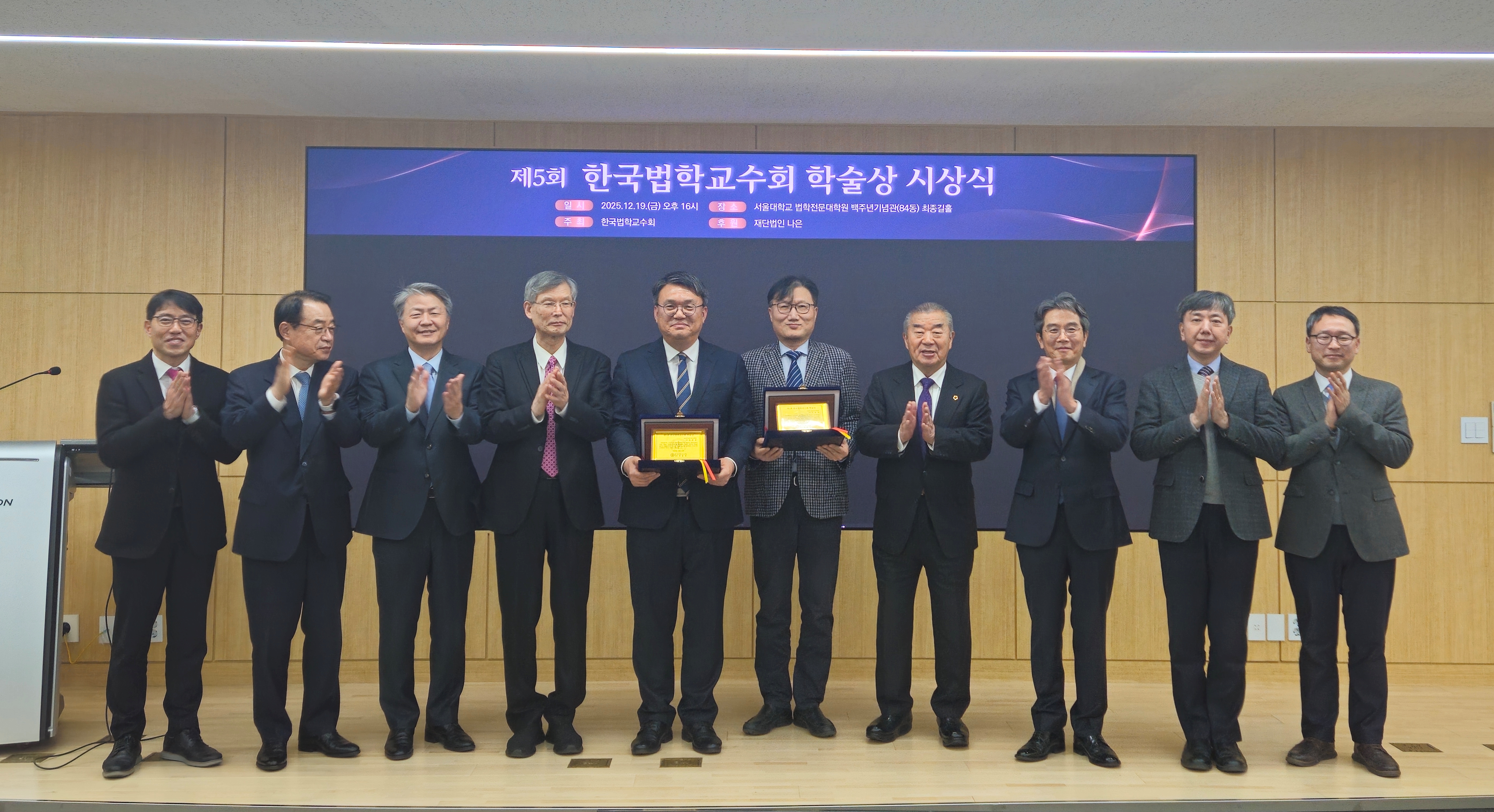 이기수 한국법학원장은 12월 19일 서울대학교에서 한국법학교수회(회장 최봉경)가 개최한 ‘제5회 한국법학교수회 학술상’ 시상식에 참석해 축사를 전했다. 이날 시상식에서는 『헌법의 시간들 : 한국헌법사, 독립운동가부터 사이코패스까지』의 저자인 이준일 고려대 로스쿨 교수와 『헌법이 말하는 통일』의 저자인 허완중 전남대 로스쿨 교수가 수상자로 선정됐다.