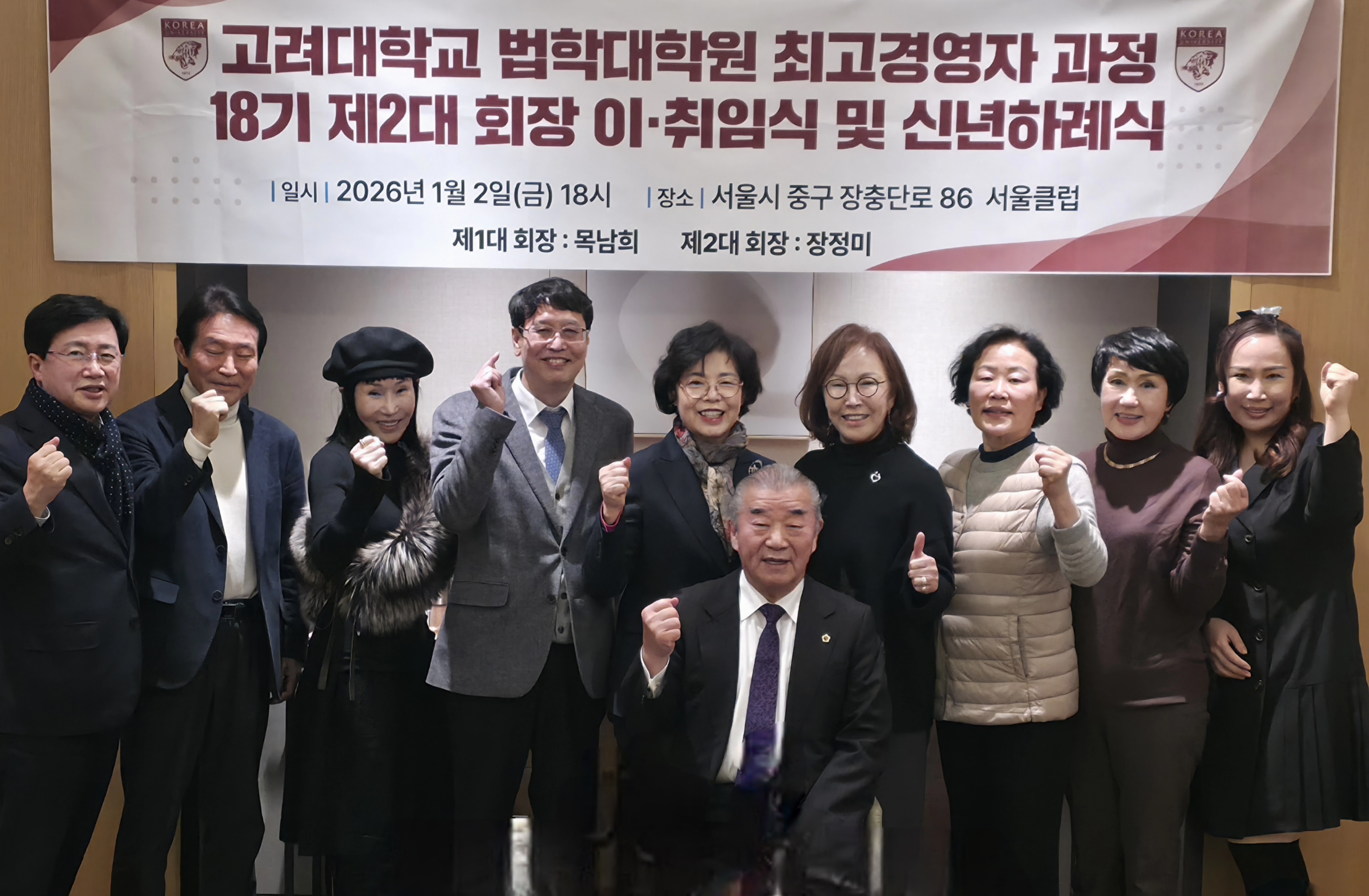 이기수 한국법학원장은 1월 2일 저녁 서울시 중구 서울클럽에서 열린 고려대학교 법학전문대학원 최고경영자과정 18기 제2대 회장(장정미) 이·취임식 및 신년하례식에 참석해 학생회 임원진을 격려했다.