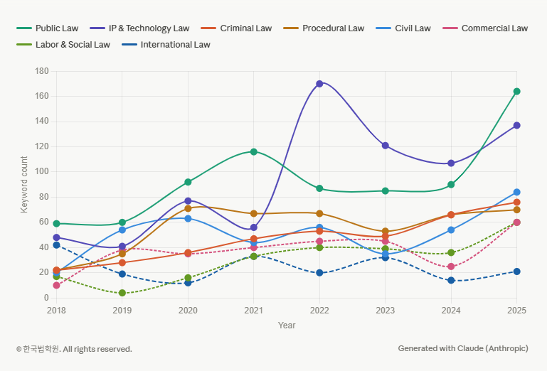 Criminal Law(형사법)과 Procedural Law(절차법)도 2025년 각각 76건, 70건으로 분석 기간 중 가장 높은 수치를 기록했다. 형사법에서는 디지털 증거, 양형 기준, 피해자 보호가 주요 키워드로 나타났으며, 절차법에서는 전자영장, 원격영상재판, 대체적분쟁해결(ADR) 등 절차 혁신과 관련된 연구가 두드러졌다.